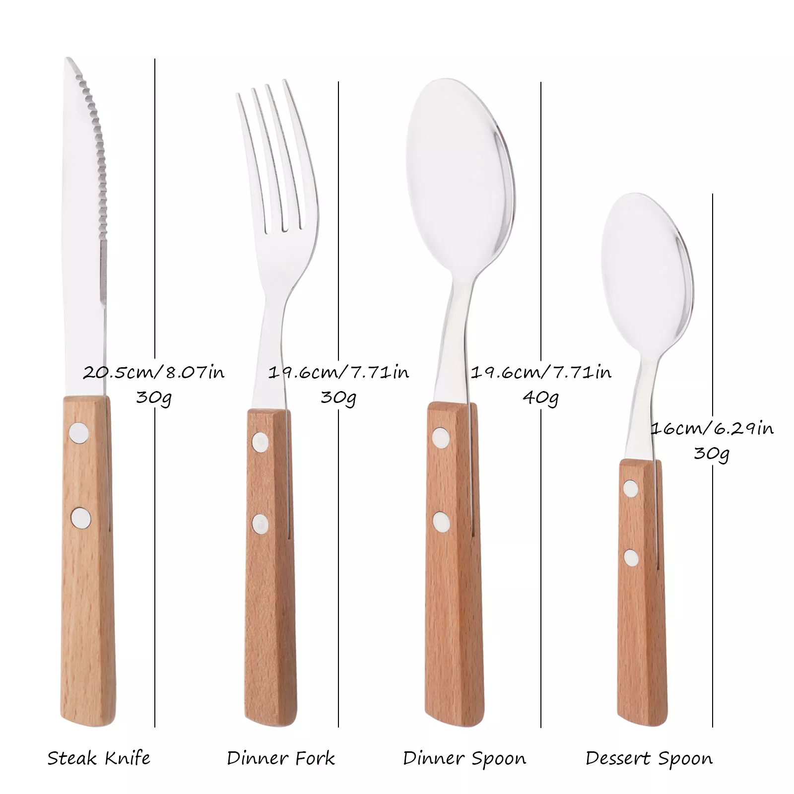 Each piece in this set – including a dinner spoon, fork, knife, and teaspoon – is made from high-quality 304 stainless steel, known for its durability and resistance to rust. The solid wood handles provide a comfortable grip, making every bite a pleasure. Whether you’re enjoying a casual lunch or hosting an elegant dinner, this set enhances every meal with ease and sophistication.