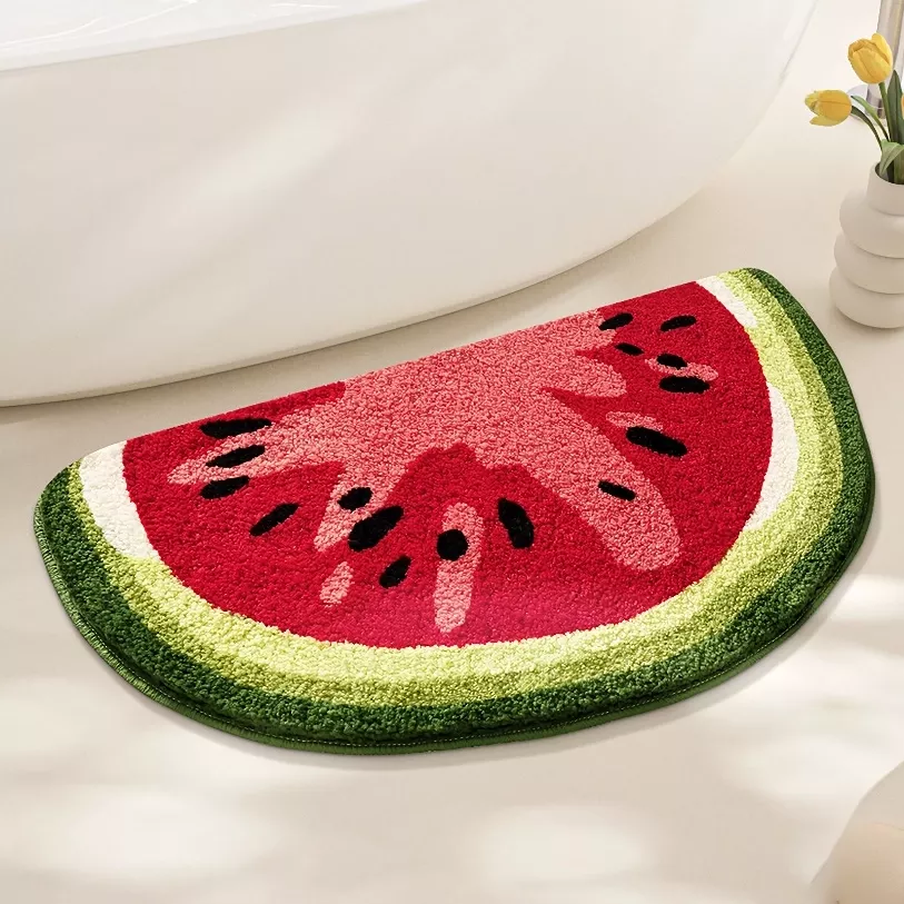 This colorful fruit mat is a versatile piece for all-around home use. Place it in your bathroom for a refreshing spa-like touch, at your bedside to start and end your day on something soft, in your kitchen for added comfort while cooking, or at your doorway to welcome guests with a burst of color. It’s also ideal for hotel rooms, dorms, or even as a playful accent in outdoor spaces like a patio or balcony.