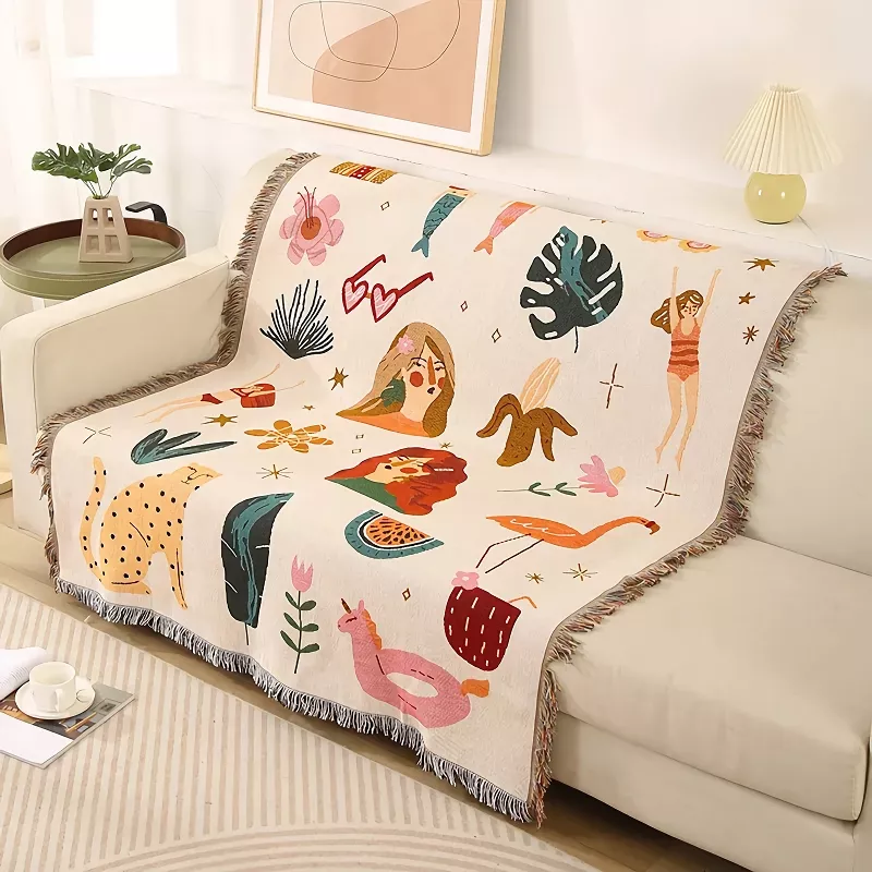 Brighten up your living space with the Fun Woven Tapestry Throw Blanket. Designed with playful charm, this blanket features vibrant cartoon-style illustrations that instantly add personality to any room. With eye-catching details like mermaids, flamingos, bananas, and flowers, it’s more than just a blanket — it’s a statement piece that brings joy and creativity into your home.