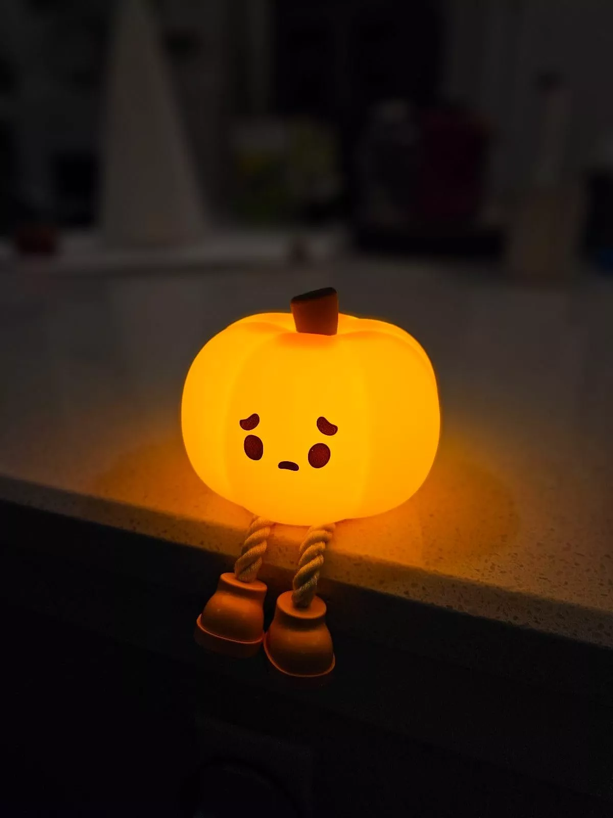 This pumpkin night light is so cute. The facial expression and little legs and shoes are just so precious. It functions great as a nightlight and you can adjust the brightness of it by tapping it. It can be set as on and you can tap it to change brightness and to turn it on and off. It also has the ability to set it so it automatically turns itself off in 30 minutes. It is very cute either sitting on a flat surface with its legs outstretched or on the edge of a table with its legs and feet dangling. It does have darker stripes/spots on the sides and top but does not distract from its cuteness.