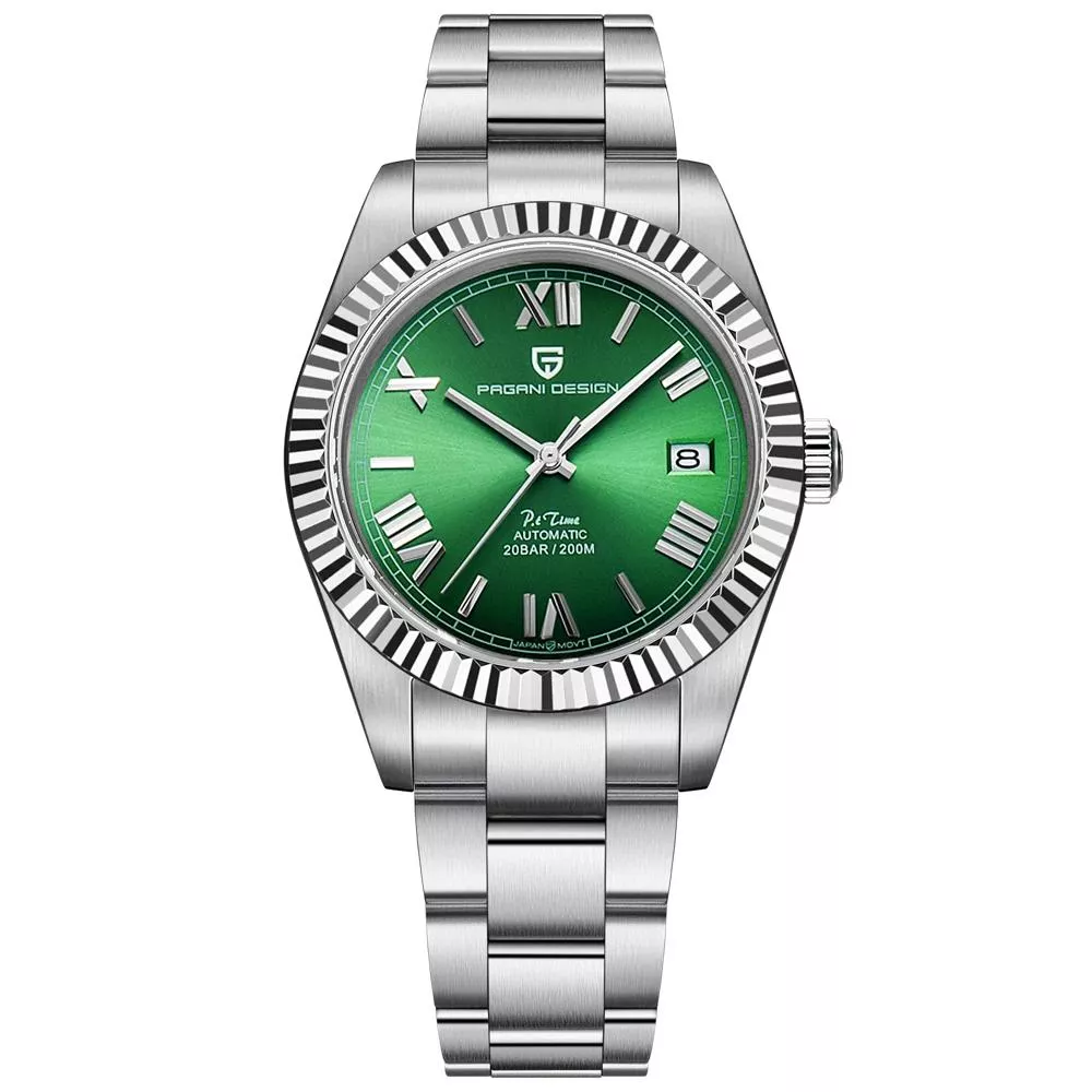 Featuring a bold, numberless dial housed beneath a durable sapphire crystal mirror, this watch is built to turn heads. Its high-performance Japanese-origin automatic and hand-wind movement ensures precise timekeeping without the need for batteries. The polished stainless steel band and case not only provide a refined finish but also ensure long-lasting durability. With a folding clasp and safety lock, this piece stays secure on your wrist through every moment.