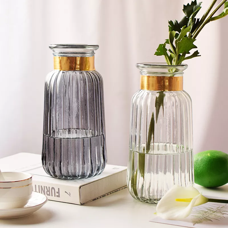 Transform your living space with this Nordic Light Luxury Glass Vase, a true statement piece for any room. The clean, modern design and subtle golden accents add a touch of sophistication, making it perfect for any contemporary decor. Whether placed on a dining table, in your living room, or as a centerpiece on a shelf, this vase brings an effortless elegance to your home.